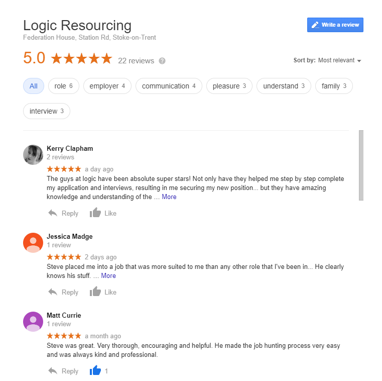 I may be biased due to this being my place of work and I may not be able to comment due to not having worked for other recruitment agencies however the feedback that Logic Resourcing receives from Candidates and Employers is nothing but positive. Why not take a look for yourself at our Google reviews if you don’t believe me?